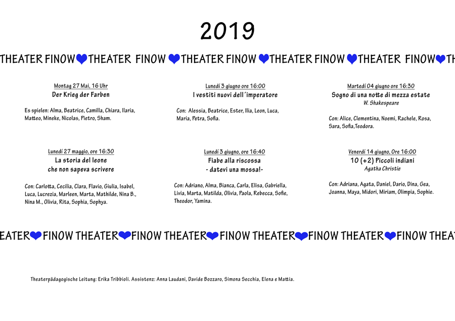 Liebe Eltern in den nächsten Tagen führen die Kinder der Theater AG verschiedene Stücke auf. Ihr seid herzlich eingeladen, Euch begeistern zu lassen, was sie alles in der Theater AG gelernt haben.